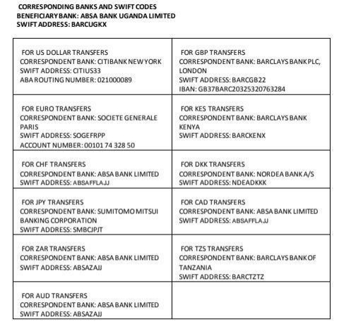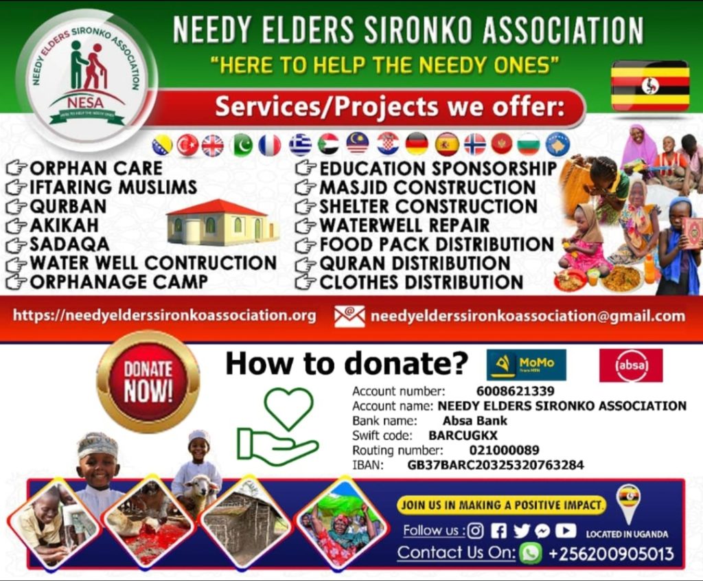 Account number: 6008621339 Account name: NEEDY ELDERS SIRONKO ASSOCIATION Bank Name: Absa Bank Swift code: BARCUGKX Routing number: 021000089 IBAN: GB37BARC20325320763284